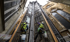 Energetic collage … window cleaners at work on Ptolemy Dean’s Weston Tower, which provides the first public access to the triforium space above Westminster Abbey’s nave. Photograph: Leon Neal/Getty ImagesNestled into an armpit of Westminster Abbey, hidden behind a flying buttress that leaps up to the chapterhouse, stands what appears to be a gothic space rocket. Sinuous bronze tracery loops its way up the faceted shaft, framing crystalline windows between bands of lead arrowheads, like go-faster stripes shooting towards the heavens.