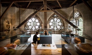 Visitors will spiral around this great mineral totem pole as they climb the new oak stairs, catching views across to the stained glass windows and carved stone details of the abbey, never before seen up close. Once at the top, the triforium galleries themselves open out as an enticing world of ancient oak beams crisscrossing their way around the attic, where exhibits have been beautifully spotlit in mercifully minimalist vitrines by museum design experts Muma (McInnes Usher McKnight Architects), the firm responsible for the V&A’s medieval and Renaissance galleries and Manchester’s Whitworth Art Gallery revamp.