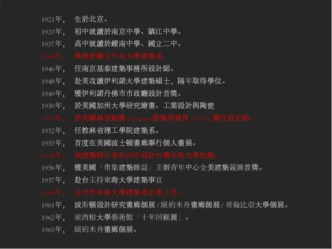 1921年到1963年,42年的时间基本是他的前半生,还是以建筑为主,绘画为辅。后半生从1964年他在台北开事务所算起,他离开了东海大学这个象牙塔。在象牙塔内,他可以发挥得很好,但是,出去以后进入了当时台湾商业高速发展的社会,他遭到迎头痛击,他发现自己不能实施想做的设计。