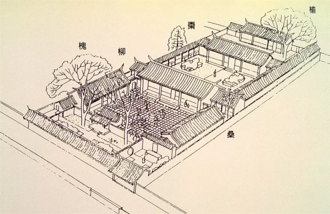 一是合院,这是一个空间形制,下图是陈其宽手绘的。陈其宽是北京人,这是他自己画的小时候的家,非常标准的四合院,有前院、前厅、后院、正房、厢房等等。值得注意的是,他不仅画建筑空间,还画了铺地和庭院里的植物,各种各样不同的树种,这是一个可以容纳日常生活的空间形制。