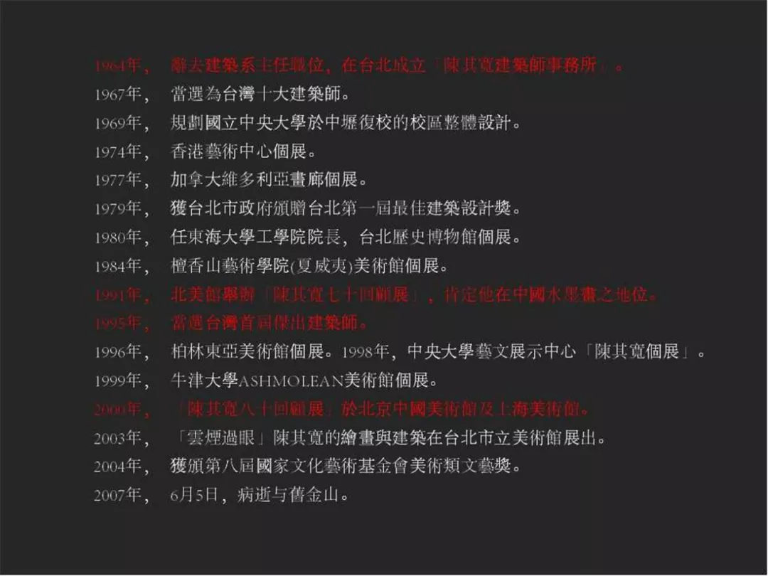 作为能够变通的中国文人,他选择离开建筑,转向绘画,他的后半生做的基本都是与美术有关的事情。在台北和世界各地都有为陈其宽办过许多展览,台湾建筑界和艺术节都曾授予他最高的荣誉。2000年,他80岁的时候曾经在北京中国美术馆、上海美术馆,办过回顾展,2007年在旧金山病逝。